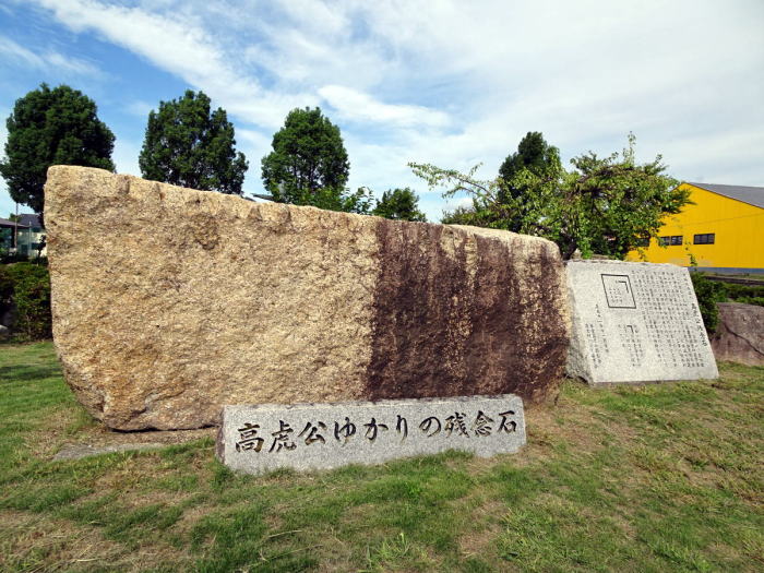 これは公園内にある高虎公ゆかりの残念石。案内板によると、この巨石は高虎が伊勢・伊賀で32万石の安濃津城主だった時、大坂城の再建に使用する目的で切り出された石ですが、何らかの理由で木津川に取り残されていたものです。後世の平成十一年、「創意と工夫の郷づくり事業」の補助を受けて設置されました。