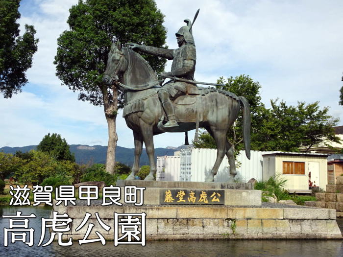 生誕地から東へ300mほど離れた高虎公園に藤堂高虎の銅像が建立されています。甲冑姿で馬に乗ったこの銅像は津城跡(三重県津市)と同じですね。