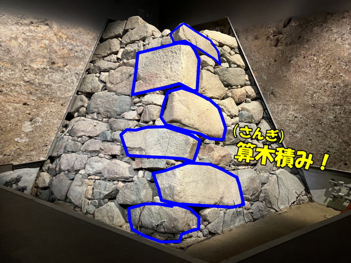 豊臣石垣館は埋められた石垣を見る施設なので地下にあります。ここでは個人的に印象深かった3つの気づきをお伝えします。まずは隅石が算木積み(さんぎづみ)になっていたこと。