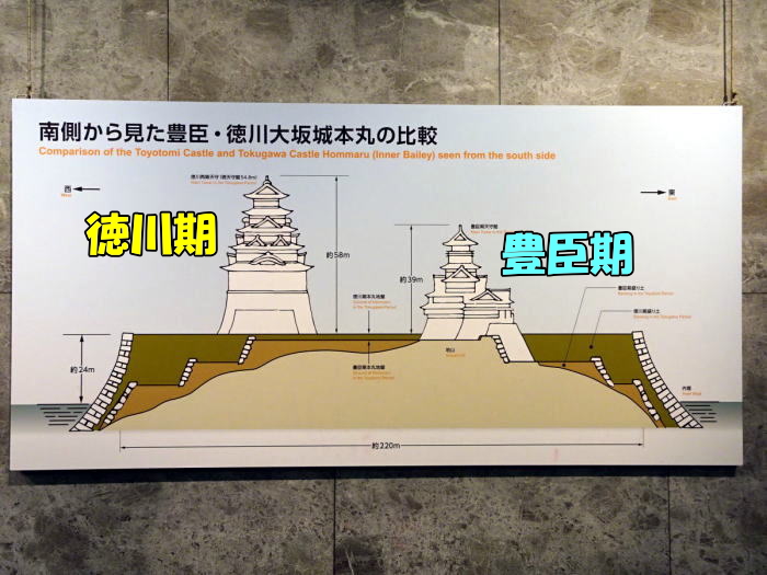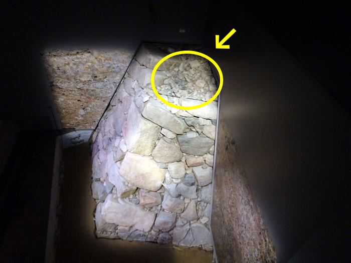 現在の大阪城は豊臣時代の大坂城をすっぽり埋めて、その上に建てられたものです。つまり私達が歩いている大阪城内は盛土の上ということ。その下に豊臣時代の石垣が埋められています。