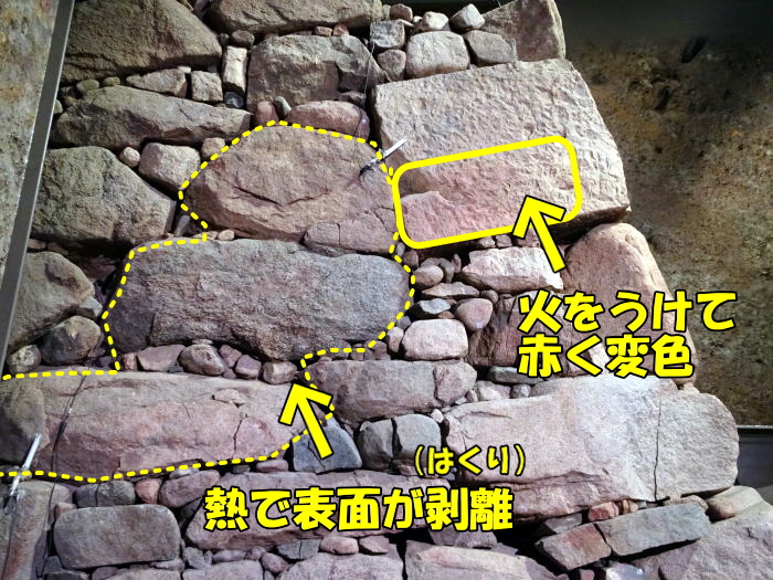 赤く変色した石。そして表面が熱で剥がれ落ちてしまった石です。大坂城落城については文献に残ってはいますが、その現物を間近に見ることができる貴重な歴史資料です。