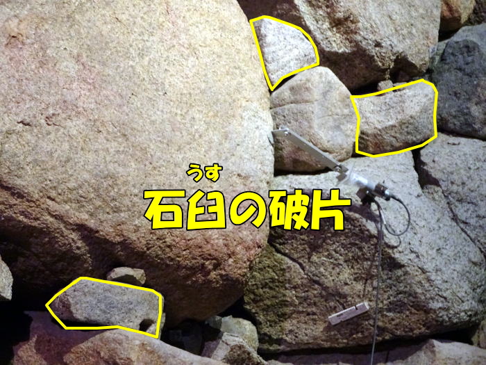 石垣のスキマを埋める間詰(まづめ)には石臼(いしうす)も使われていました。石臼は庶民でも提供できる石なので、現地調達もしやすかったのではないでしょうか。石垣に石臼が使われている例は他にもあり、有名なのは姫路城の姥ヶ石(うばがいし)です。
