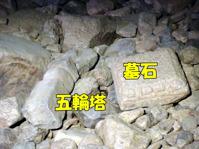例えば豊臣石垣館の中では五輪塔や墓石の一部が石垣内部に埋め込まれていました。なぜ墓石などを石垣の中に埋め込むのかという理由は、単に石材として利用されたと考えられています。石を遠くから運ぶのも大変な時代なので、現地調達の墓石は利用しやすいものだったのでしょう。