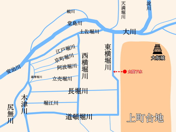 太閤下水(背割下水)の仕組みを簡単に説明します。大坂城と城下町は上町台地という高台にあります。その大地の下、東側に東横堀川という、大坂城の外堀の役割だった川が流れているのですが、そこに向けて下水を流していました。その残っている一部が背割下水、別名・太閤下水です。