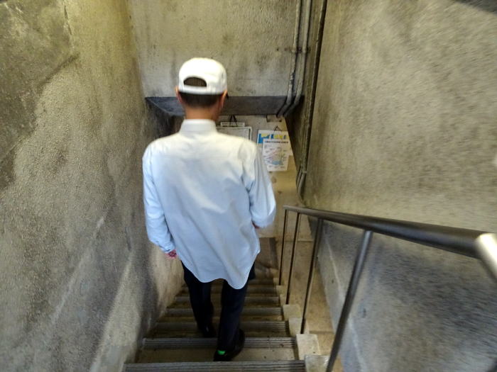 スタッフに案内されて地下へ移動。通路は狭いです。