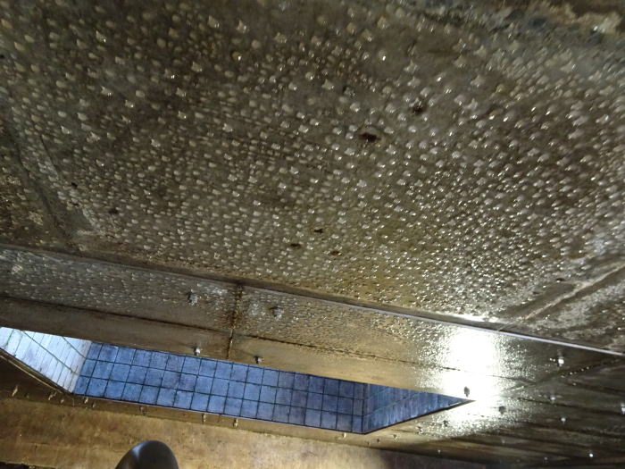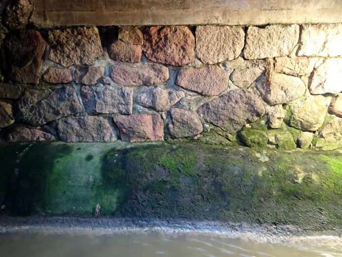 天井を見ると水滴が…?これはスタッフに注意されたことですが、太閤下水は外より気温が高く、室内の天井に水滴ができるのだとか。だから頭上に注意して見学してくださいとのこと。確かに帽子をかぶった状態だと、水滴落ちてきても気づきませんからね。