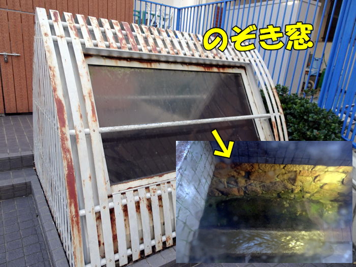 大阪市立南大江小学校の前に太閤下水の中を見ることができる場所があります。ここからだと数メートルくらい下を流れています。