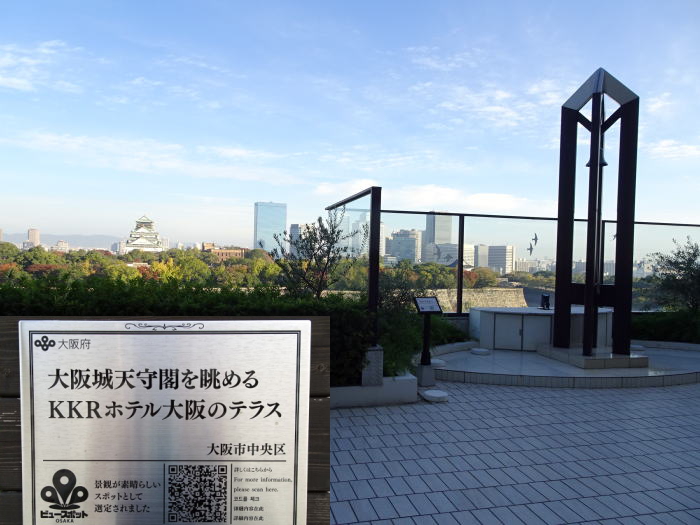 平日でテラスの利用客(結婚式など)が無い場合、テラスも一般客に解放され、ここからは外で大阪城天守を眺める事ができます。私の感想ですが、KKRホテル大阪は大阪城にも近いし、何と言っても大阪城天守を眺める事ができるホテルのひとつですし、また料金もリーズナブルなのでオススメです。